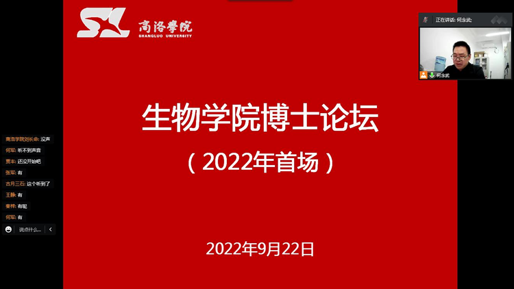 9月22日,生物醫(yī)藥與食品工程學(xué)院博士論壇2022年首場(chǎng)學(xué)術(shù)交流活動(dòng)在云端順利舉行。本次論壇特邀我院2位客座教授——西北大學(xué)博士生導(dǎo)師趙桂仿,陜西省農(nóng)村科技開(kāi)發(fā)中心、陜西省獼猴桃工程技術(shù)研究中心主任雷玉山研究員蒞臨云端全程指導(dǎo)。生物學(xué)院院長(zhǎng)王學(xué)軍出席論壇活動(dòng)。生物學(xué)院全體教師及部分畢業(yè)班學(xué)生在線上參加論壇。論壇由副院長(zhǎng)何念武主持。