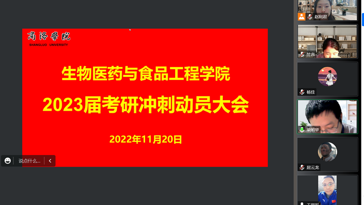 為了充分調動2023屆畢業(yè)生考研積極性,盡早明確考研目標與就業(yè)方向, 11月20日晚,生物學院通過釘釘線上平臺組織召開了2023屆考研沖刺動員大會。學院黨政領導、教師代表及2023屆考研學生參加會議。