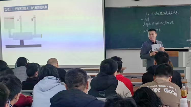 水江麗老師以《聚焦核心素養(yǎng),促進(jìn)深度學(xué)習(xí)》為題作了專題學(xué)術(shù)報告,從核心素養(yǎng)重構(gòu)未來教育藍(lán)圖、基于核心素養(yǎng)的教學(xué)設(shè)計和促進(jìn)深度學(xué)習(xí)的教學(xué)建議三個方面闡述了中學(xué)物理教學(xué)中如何聚集核心素養(yǎng)培養(yǎng)、促進(jìn)學(xué)生深度學(xué)習(xí)。柴勇勇老師在示范教學(xué)《流速與壓強(qiáng)的關(guān)系》一課講授中,從小實驗引入新課,通過圖片補(bǔ)充讓學(xué)生輕松接受流體的概念,再通過實驗讓學(xué)生總結(jié)得出科學(xué)結(jié)論,并運用結(jié)論解釋生活中的各種現(xiàn)象。