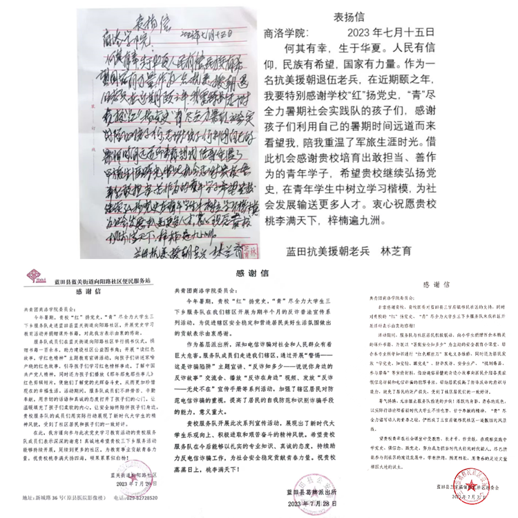 實踐活動扎實開展 社會團體高度認可。活動期間,實踐隊全體隊員工作準備充分、實踐狀態(tài)積極、內(nèi)容豐富充實。向參與活動的社區(qū)居民、學生普及黨史知識,對其提升政治能力起到了明顯的促進作用,受到當?shù)孛癖姷囊恢潞迷u,收到了來自抗美援朝老兵林芝育手寫表揚信1封和來自藍關街道向陽路社區(qū)、葛牌派出所、三官廟移民社區(qū)感謝信3封,字里行間承載了受訪者和實踐單位對電信學院"紅"揚黨史,“青”盡全力社會實踐隊的感謝和認可。