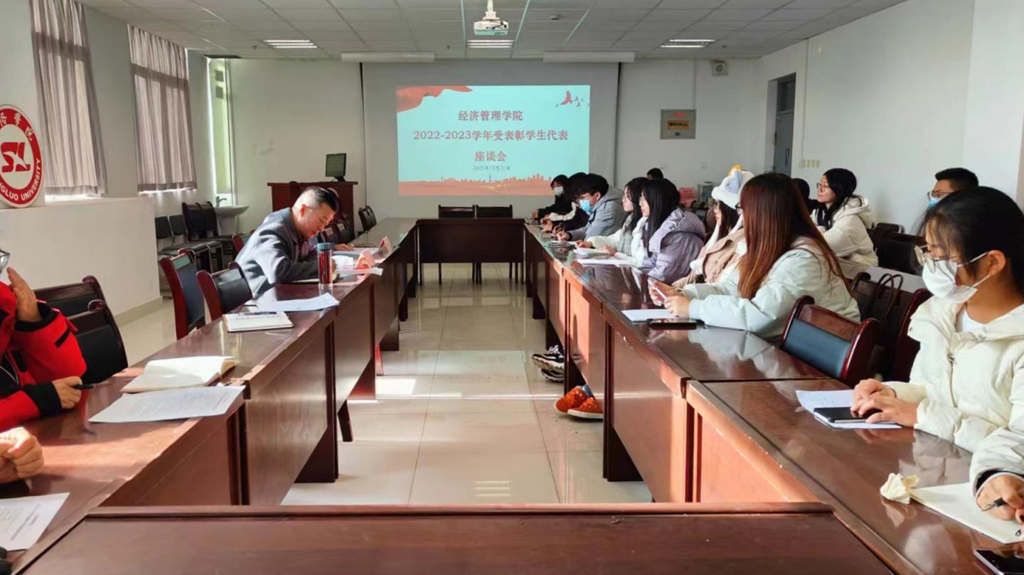 為表彰先進(jìn),樹(shù)立榜樣,營(yíng)造比學(xué)趕超的良好氛圍,12月21日,經(jīng)濟(jì)管理學(xué)院組織召開(kāi)2022-2023學(xué)年受表彰學(xué)生代表座談會(huì)。學(xué)院黨政領(lǐng)導(dǎo),全體輔導(dǎo)員和2022-2023學(xué)年榮獲三好學(xué)生、優(yōu)秀學(xué)生干部、十佳大學(xué)生、先進(jìn)班集體的學(xué)生代表30余人參加會(huì)議。會(huì)議由學(xué)院黨委書(shū)記高擴(kuò)昌主持。