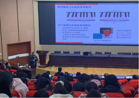 張勝貴教授以《斐波那契數(shù)列》為題,從數(shù)列的來源、與黃金分割的關(guān)系和應(yīng)用等方面,完整、詳細(xì)地介紹了斐波那契數(shù)列。整場報(bào)告深入淺出,與會(huì)師生共同體驗(yàn)斐波那契數(shù)列的美與價(jià)值。