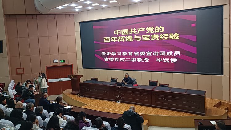 畢遠佞簡要介紹了自己的求學(xué)歲月、工作經(jīng)歷以及研究黨史的基本思路和方法。他表示,高校教師承擔(dān)的責(zé)任和肩負(fù)的使命很重要,應(yīng)該堅持讀原著、學(xué)原文、悟原理,自覺樹立正確的黨史觀,堅定歷史自信,增強歷史主動,積極引導(dǎo)學(xué)生形成正確的世界觀、人生觀、價值觀。此外,要堅持理論武裝同常態(tài)化長效化開展黨史學(xué)習(xí)教育相結(jié)合,做到學(xué)史明理、學(xué)史增信、學(xué)史崇德、學(xué)史力行。畢遠佞緊密圍繞中國共產(chǎn)黨的奮斗歷程、寶貴經(jīng)驗、學(xué)習(xí)黨的歷史踐行初心使命三個方面展開講解。他講到,《中共中央關(guān)于黨的百年奮斗重大成就和歷史經(jīng)驗的決議》將中共黨史劃分為四個歷史時期,每個時期都承擔(dān)著重要的歷史使命和任務(wù)。在一百多年的奮斗歷程中,中國共產(chǎn)黨形成了堅持黨的領(lǐng)導(dǎo)、推動理論創(chuàng)新、堅定“四個自信”、勇于“自我革命”等一系列寶貴經(jīng)驗。在新時代背景下,應(yīng)該繼續(xù)堅定理想信念,用黨的創(chuàng)新理論武裝頭腦、指導(dǎo)實踐和推動工作,著力解決人民群眾急難愁盼問題。