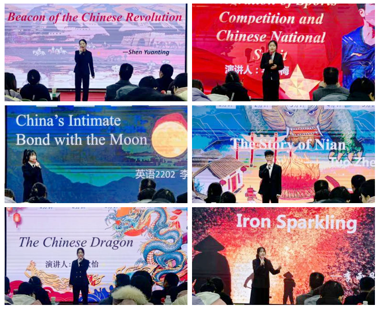 選手的演講內(nèi)容既涵蓋了春節(jié)、中國(guó)龍、書(shū)法、絨花、打鐵花等中國(guó)傳統(tǒng)文化元素,也包括革命故事、體壇健兒、太空探索、木蘭從軍等展現(xiàn)中國(guó)精神的事例。選手們以飽滿的精神、從容的臺(tái)風(fēng)、流利的口語(yǔ)展現(xiàn)出英語(yǔ)專(zhuān)業(yè)學(xué)生扎實(shí)的專(zhuān)業(yè)基礎(chǔ)、良好的口語(yǔ)水平和自信的青春風(fēng)采。