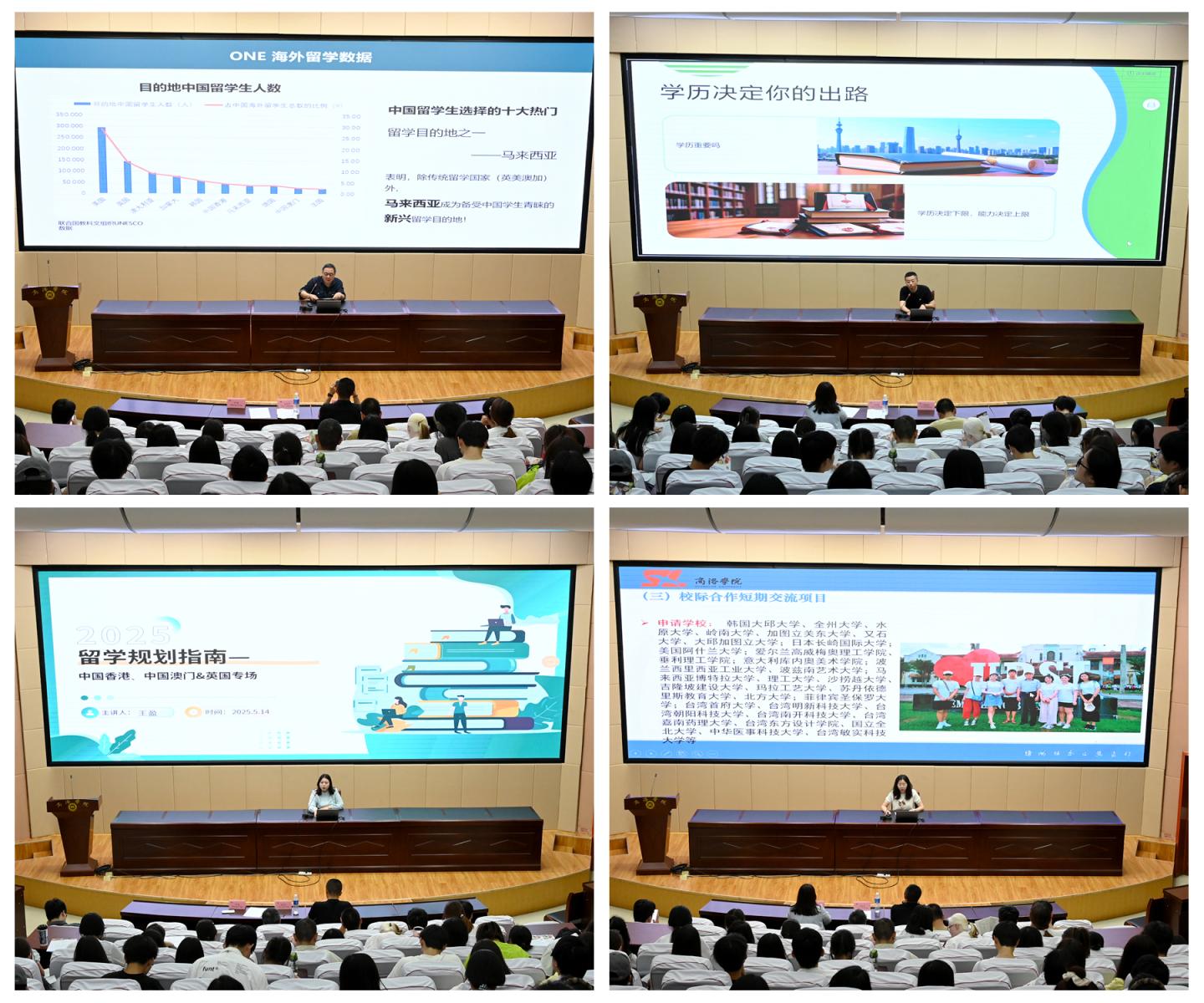 宣講會上,陜西省學生就業(yè)與留學服務(wù)中心姚運章、于智丞、王盈三位老師分別就德國、馬來西亞、日本、韓國、英國等國家高校碩士項目優(yōu)勢特色、申請政策、留學生就業(yè)政策等進行了詳細解讀。國際合作與交流處楊嬌詳細介紹了我校學生出國(境)交流學習項目途徑和獎勵資助政策。學生代表財務(wù)管理2231班張思揚、財務(wù)管理2331班衛(wèi)一蘋分享了各自在馬來西亞博特拉大學交換學習和牛津大學訪學期間的見聞與收獲,以親身經(jīng)歷激發(fā)同學們對國際化學習的熱情。