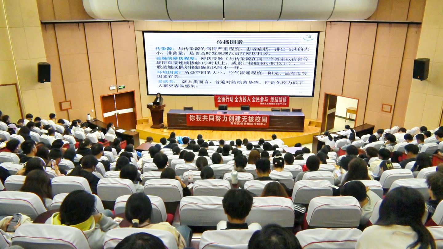 張曉榮首先從結(jié)核病危害、結(jié)核病的流行環(huán)節(jié)、結(jié)核病診斷治療預(yù)防三方面展開,結(jié)合生動案例向師生進(jìn)行了深入講解,呼吁師生養(yǎng)成良好衛(wèi)生習(xí)慣,加強(qiáng)體育鍛煉,提高抵御疾病的能力。隨后,張曉榮向師生明確了結(jié)核病潛伏感染者的定義,她指出,結(jié)核潛伏感染并不等同于罹患結(jié)核病,預(yù)防性治療是降低結(jié)核病潛伏感染者發(fā)展為結(jié)核病患者的有效手段。